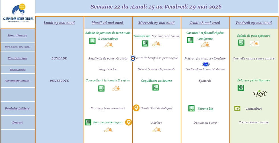 Menus du lundi 6 avril au vendredi 29 mai 2026 Jérôme Pinascoil y a 9 heures1 min de lectureVous trouverez ci-dessous l'ensemble des menus du restaurant d'enfant pour les prochaines semaines ! Et bon appétit bien sûr !